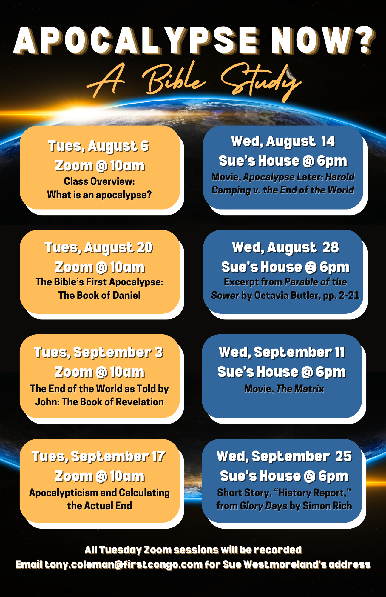 End times. Apocalypse. The second coming of Christ - these have been some of Google's most popular search terms for the last few years. But, what do any of these words actually mean, and what importance do they have for our faith? Let’s look together at what "apocalypse" is in the Bible, what it's come to mean today, and what it might teach us about ourselves in this historical moment. We'll look at two key books from scripture along the way – Daniel and Revelation – along with a variety of cultural sources that invite us to imagine the “end.”