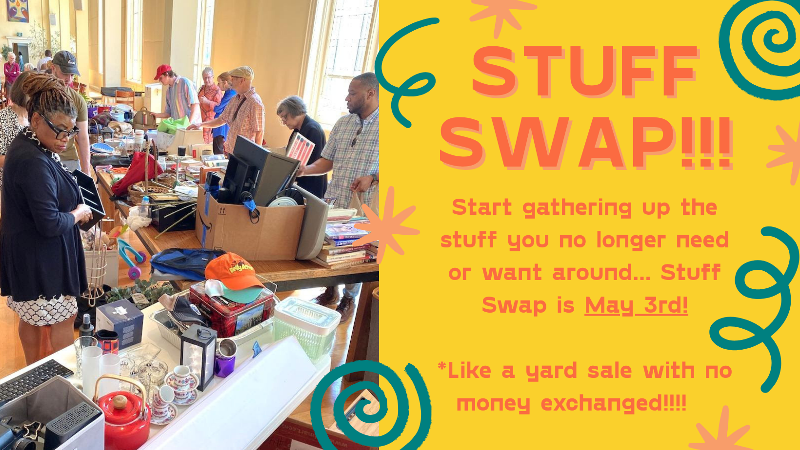 It’s like a yard sale with no money exchanged! Bring stuff you no longer want or need to church on May 3, and swap it with someone who does!